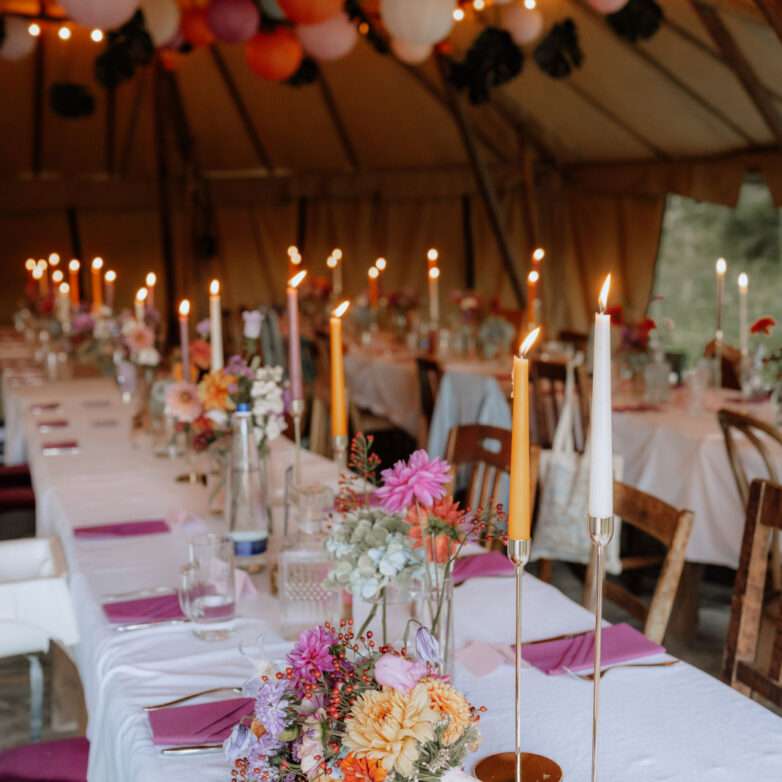 Farben prägen die Stimmung eurer Hochzeit. Ob zarte Pastelltöne, kräftige Herbstfarben oder elegante Gold- und Cremetöne – die Farbpalette sollte zu euch und eurer Location passen. Dekoration, Tischkarten, Blumen und sogar das Brautkleid lassen sich darauf abstimmen.