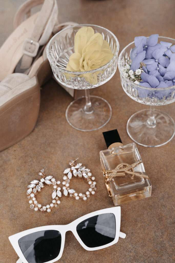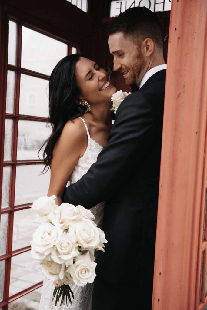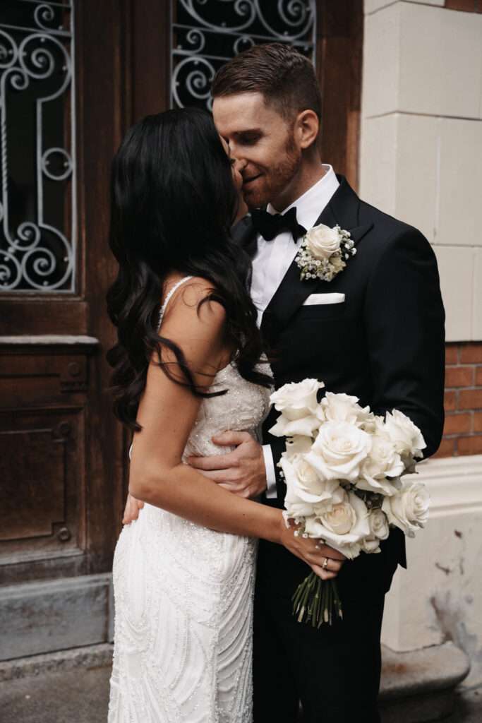 Der Brautstrauß – klassisch mit weißen Rosen und Schleierkraut, modern gebunden – strahlte zeitlose Eleganz aus. In der ansonsten dunklen Location kam die Tischdeko besonders zur Geltung: Viele einzelne Sträuße in kräftigen Farben – mit Dahlien, Gerbera, Rosen und weiteren Blüten – brachten Lebendigkeit und Frische in den Raum. Ein besonderer persönlicher Akzent waren die Stabkerzen, die die Braut selbst gestaltet hatte und die mit ihrer individuellen Note die Dekoration perfekt ergänzten.