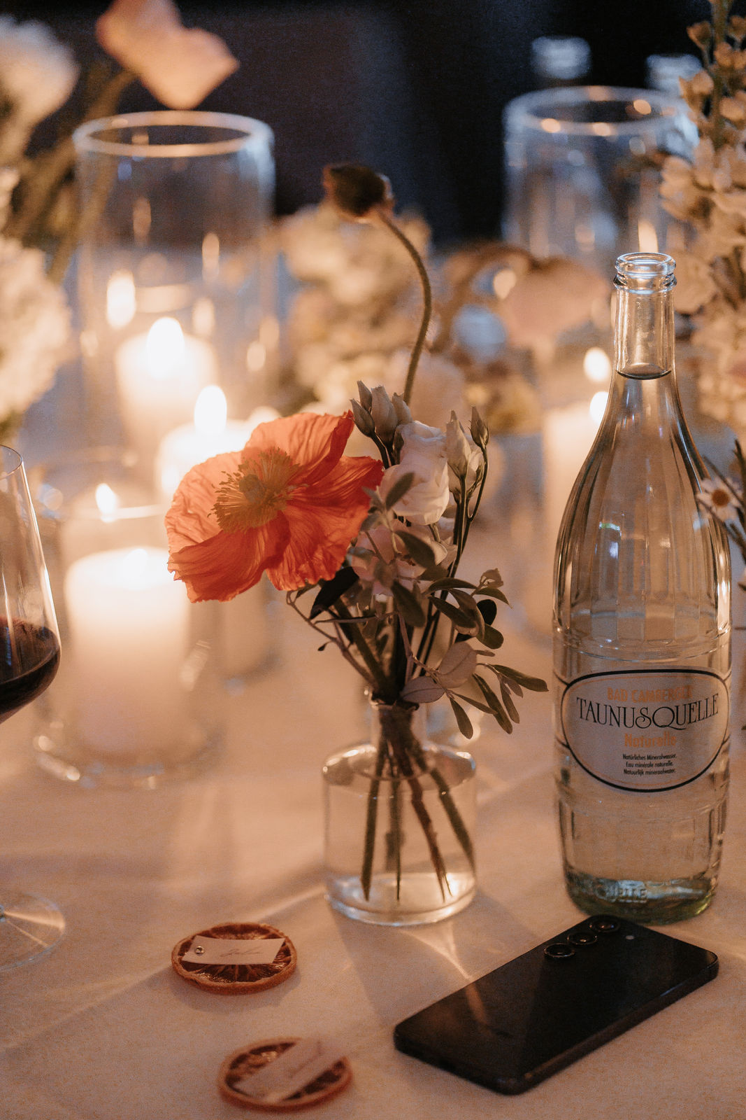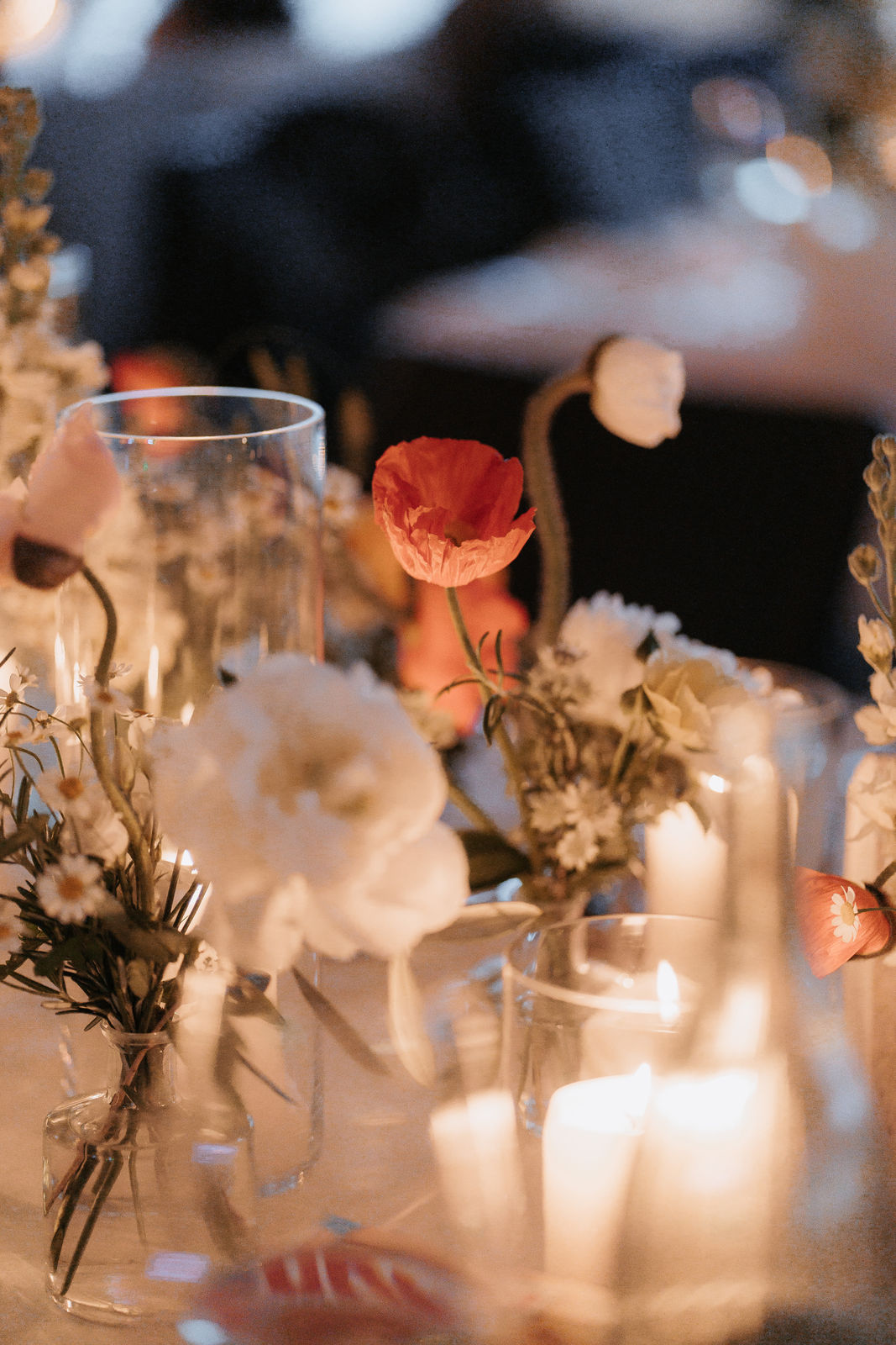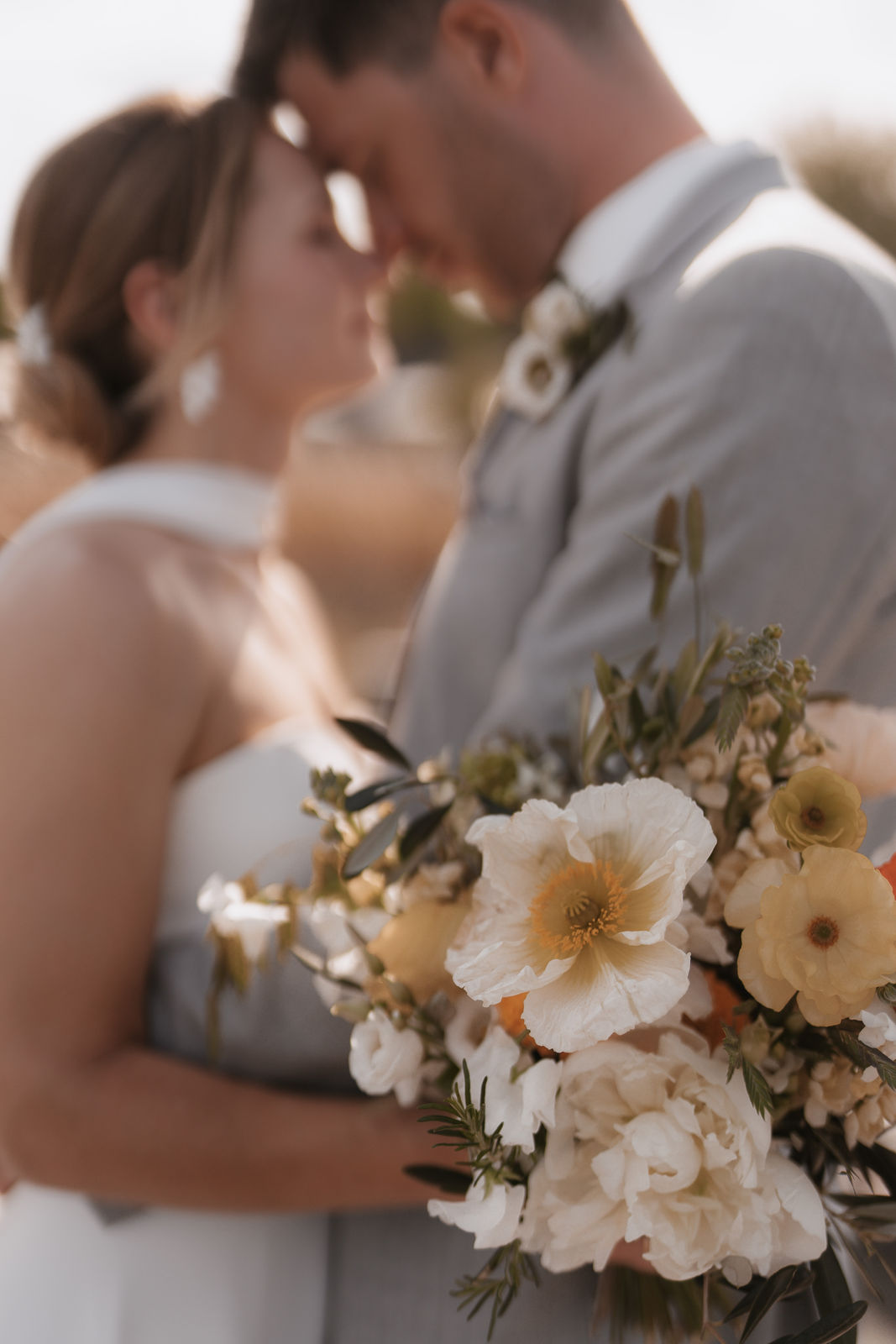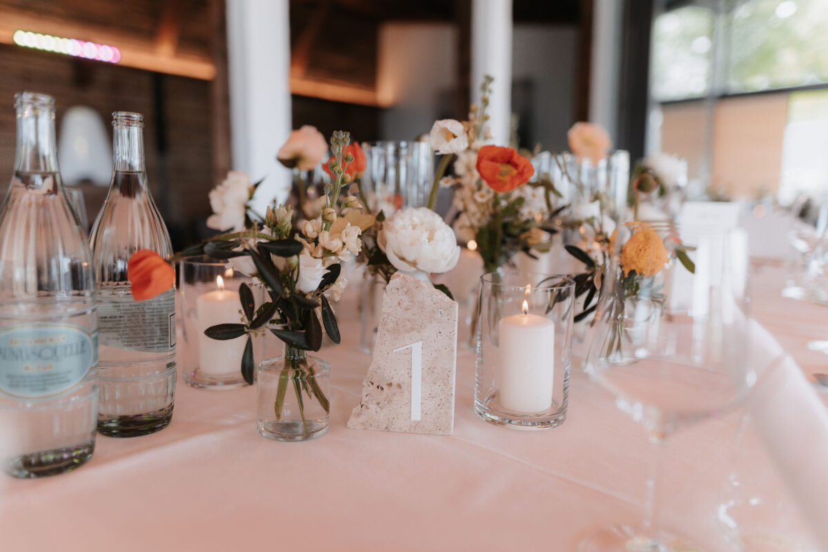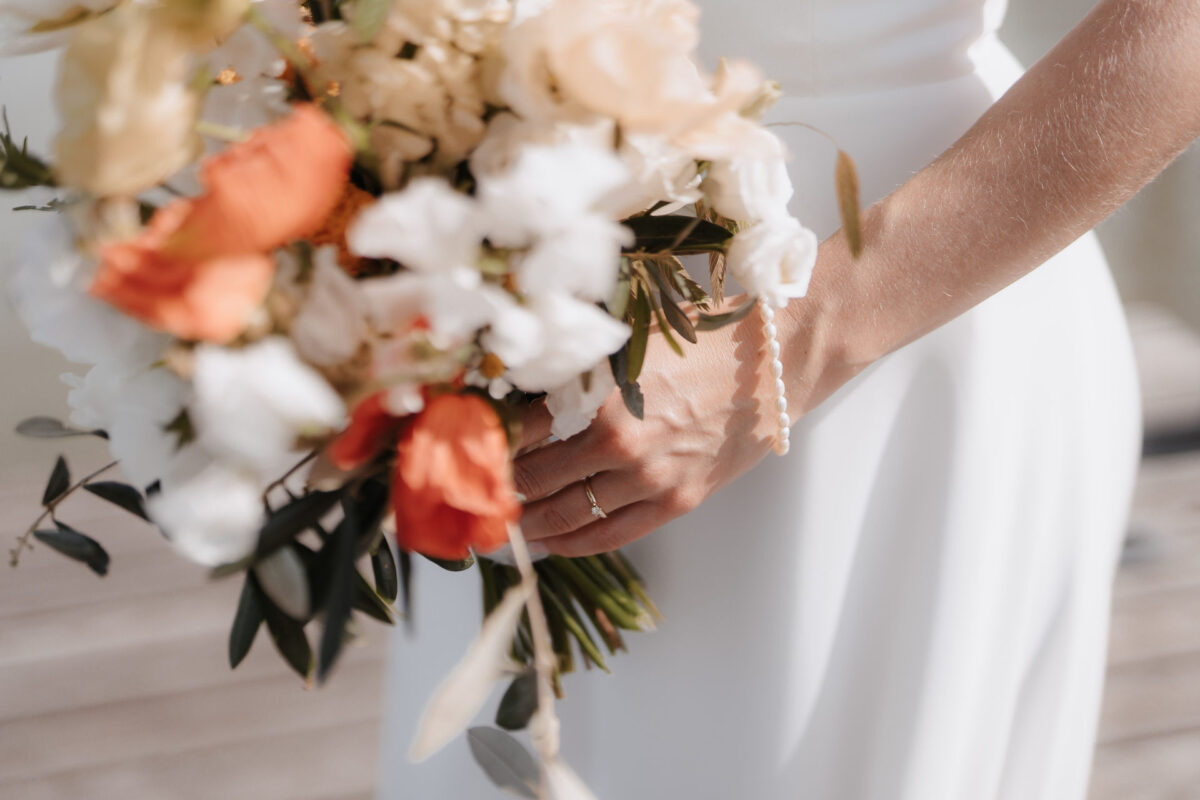 Die florale Gestaltung griff frische, warme Farbtöne auf – zartes Orange, sanftes Gelb und viel Weiß sorgten für eine helle und natürliche Atmosphäre. Mohnblumen, Pfingstrosen, Ranunkeln, Levkojen und Olivenzweige brachten einen Hauch von mediterranem Flair in die Dekoration und unterstrichen den frühlingshaften Charakter dieser Maihochzeit.