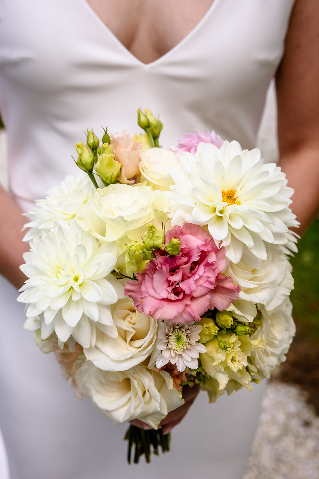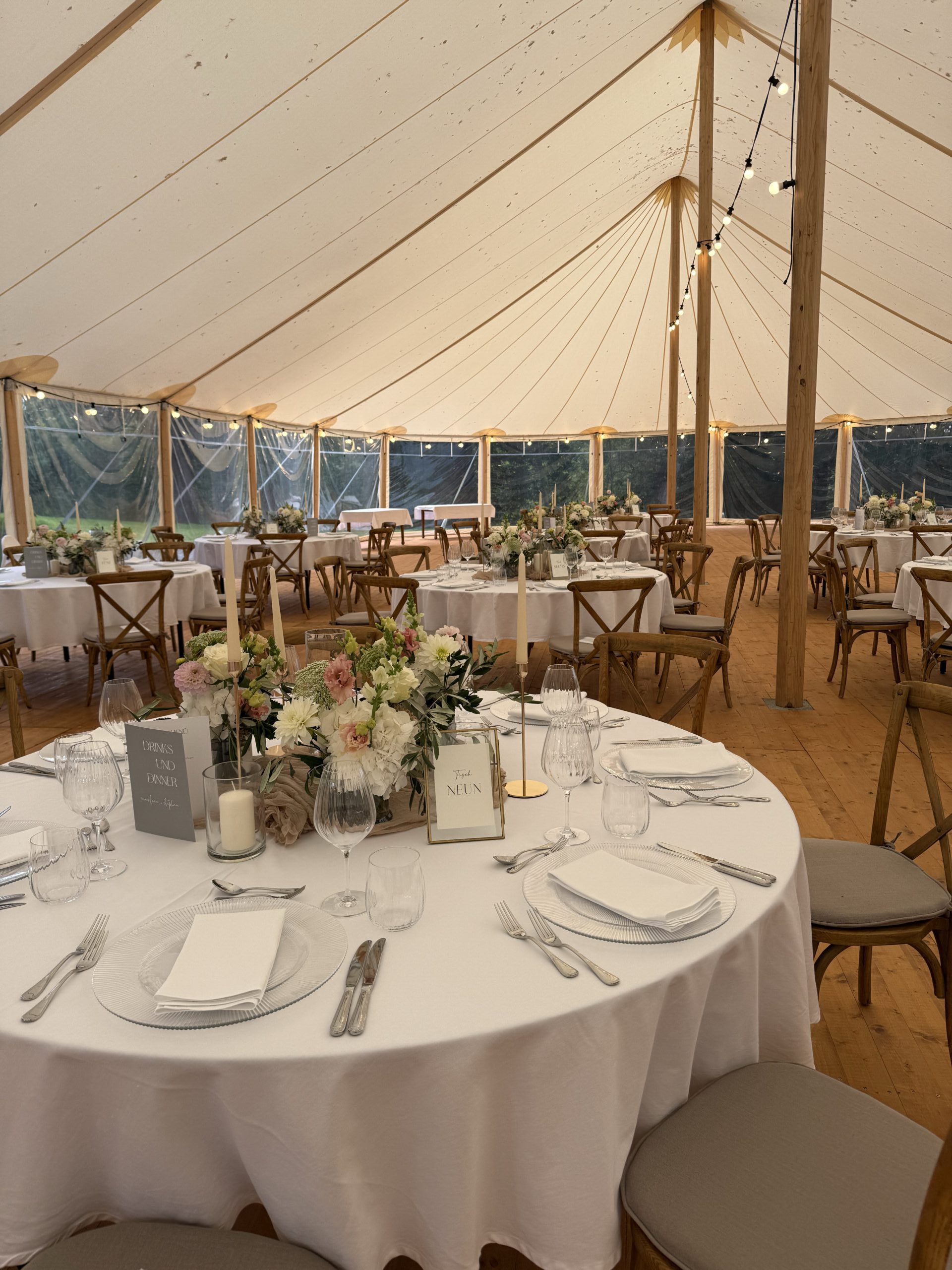 Die anschließende Feier fand in einem elegant dekorierten Zelt auf dem Gelände des Schlossguts statt. Die florale Gestaltung war bewusst zeitlos und harmonisch gewählt: Weiß und zarte Rosétöne bestimmten das Farbkonzept und verliehen der Hochzeit eine ruhige, elegante Ausstrahlung. Dahlien, Hortensien, Eustoma, Rosen und Olivenzweige sorgten für eine natürliche Leichtigkeit und fügten sich wunderbar in das stilvolle Ambiente ein.