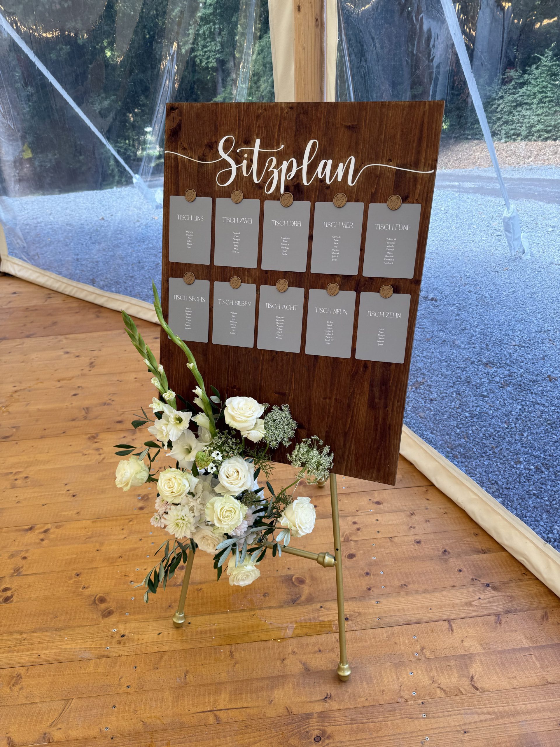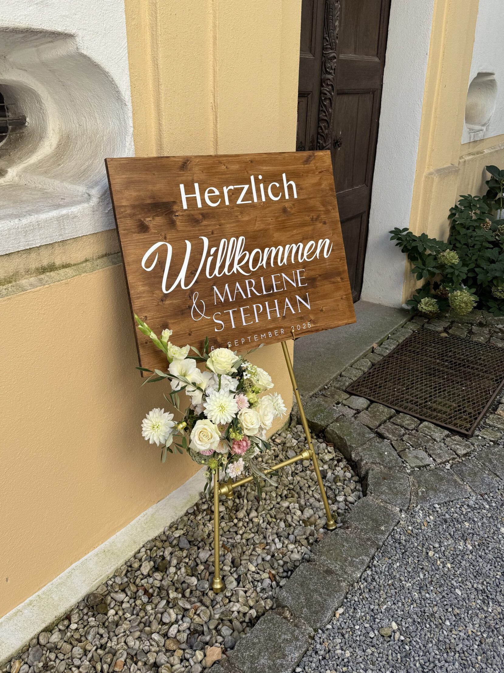Viele der verwendeten Dekorationselemente – wie Kerzenhalter, Vasen oder Rahmen – können ganz unkompliziert über mich ausgeliehen werden. So entsteht ein stimmiges Gesamtkonzept, ohne dass sich das Brautpaar um zusätzliche Dekorationsartikel kümmern muss.